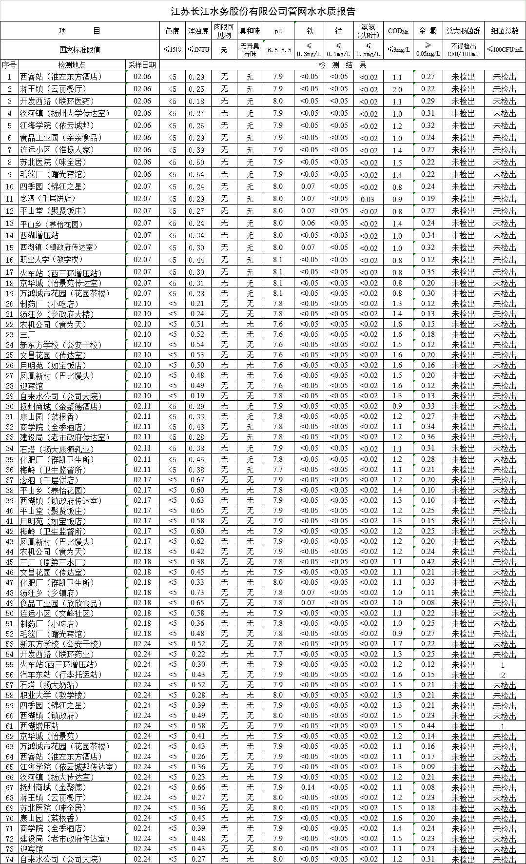 江蘇長(zhǎng)江水務(wù)股份有限公司管網(wǎng)水水質(zhì)報(bào)告(2020年2月)