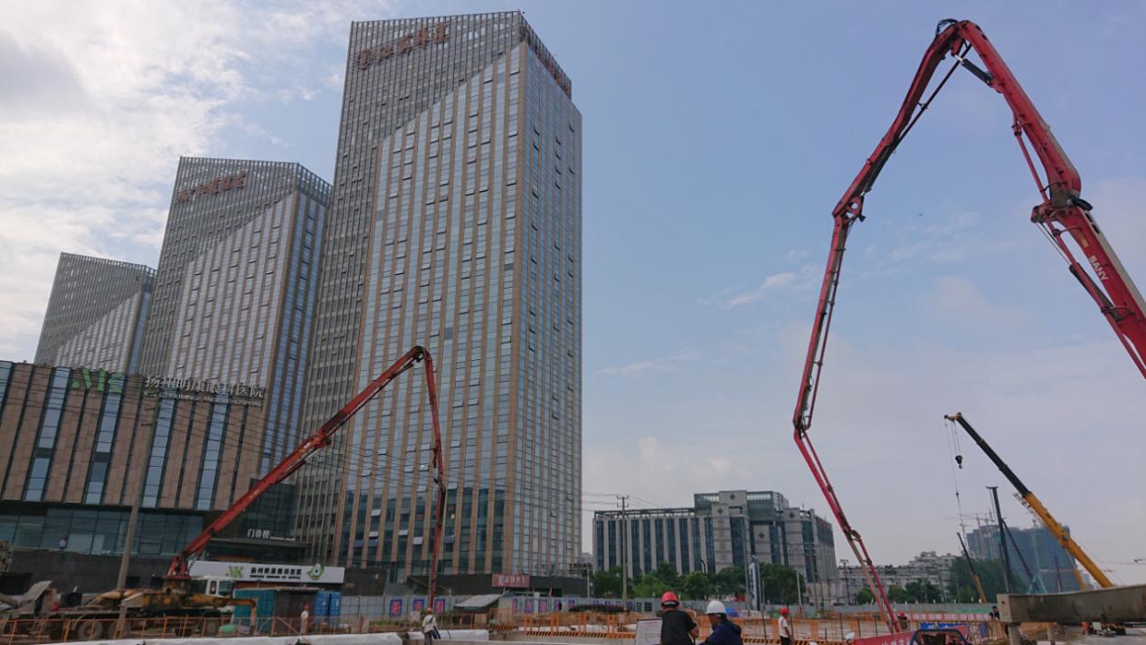 15時30分,第一輛混凝土車在文昌路南側(cè)敞開段施工現(xiàn)場外等候;15時40分,混凝土坍落度實驗開始;15時43分,隨著一聲響亮的信號,兩輛泵車輸送管同時就位,文昌路隧道首段底板正式澆筑……