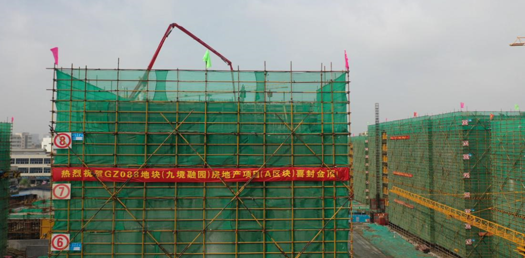 9月18日一早,九境融園項(xiàng)目施工現(xiàn)場(chǎng)萬(wàn)里晴空、惠風(fēng)和暢,寫著“熱烈祝賀GZ088地塊(九境融園)房地產(chǎn)項(xiàng)目(A區(qū)塊)喜封金頂”字樣的橫幅格外閃耀。伴隨著3、5號(hào)樓屋面頂板混凝土澆筑,在建設(shè)單位、監(jiān)理單位及施工單位的共同見(jiàn)證下,九境融園項(xiàng)目A區(qū)塊工程正式完成全部主體結(jié)構(gòu)的封頂。