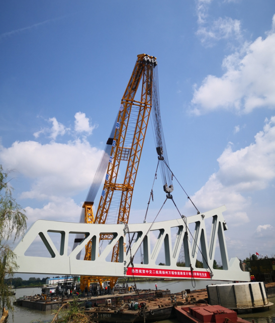 萬??焖俾肪┖歼\河大橋全長224米,設計時速為80公里,為連續(xù)下承式鋼桁架拱橋,整體設計造型呈曲線弧形,橫臥運河,猶如雙龍并行。該橋上部結構包含鋼桁架拱肋、橫梁、橋面板、風撐及附屬設施等,總寬53.2米,為運河上超寬橋梁。本次吊裝的第一片鋼桁架為大橋拱肋部分,位于大運河西岸,長48.7米,重200噸,采用600噸浮吊船進行吊裝。
