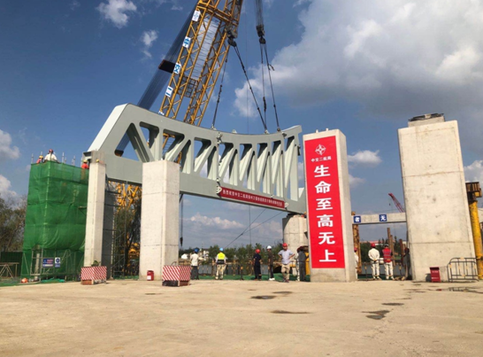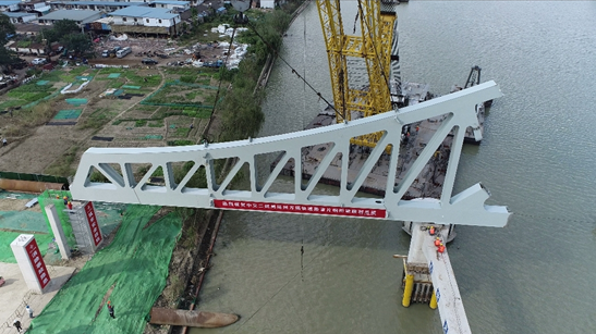 鋼桁架安裝是大橋整個施工過程中施工難度最大、技術要求最高的環(huán)節(jié),項目部從構件進場、吊裝、精準定位,每一道工序、環(huán)節(jié)都實行全過程、無縫隙的標準化管理,全力確保安裝和細節(jié)滿足技術要求。為確保首節(jié)鋼桁架吊裝工作有序開展,項目部成立了專項施工領導小組,多次組織召開籌備會并進行吊裝試驗。由于吊裝施工是在繁忙的運河Ⅱ級航道,航道運輸船舶眾多,為確保航道安全,項目部多次與地方海事協調,提前發(fā)布封航通告,吊裝過程實施水上臨時交通管制,為安全順利吊裝提供了堅實保障。
