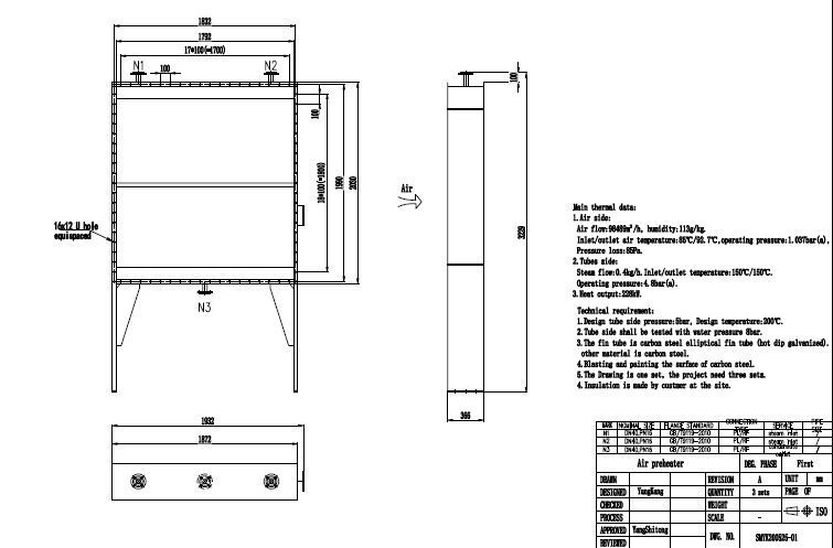 1 | 預(yù)加熱器 | 按現(xiàn)場接口、尺寸要求進(jìn)行訂制。殼程:熱空氣,98489m3/h,溫度<92℃;管程:蒸汽,0.4kg/h,溫度<150℃,壓力<4.8bar | 凱絡(luò)文、雙木、林德 | 臺(tái) | 1 |