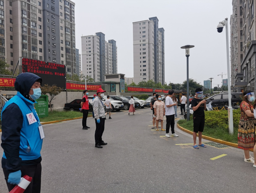 “請(qǐng)大家排好隊(duì),保持一米以上安全距離,不要造成人員聚集,請(qǐng)?zhí)崆皽?zhǔn)備好你的身份證……”志愿者不斷提醒居民注意。在翠月花園核酸采集點(diǎn),志愿者們穿梭在排隊(duì)人群中,邊安撫居民緊張情緒,邊引導(dǎo)居民即測(cè)即走?!半m然天氣很悶熱,工作量很大,但是我們有信心能保質(zhì)保量完成全小區(qū)核酸檢測(cè)任務(wù)?!彼麄儾活櫤韲邓粏。琅f熱情且耐心地回答居民的問(wèn)題,引導(dǎo)現(xiàn)場(chǎng)秩序。11日下午,雨淅淅瀝瀝下個(gè)不停。雖然避雨棚近在咫尺,但志愿者們面對(duì)風(fēng)雨寸步不離崗位,他們笑著說(shuō)道“這點(diǎn)風(fēng)雨算啥呀?”一周來(lái),志愿者們協(xié)助社區(qū)開(kāi)展了4次核酸檢測(cè),共檢測(cè)居民約12000人次。