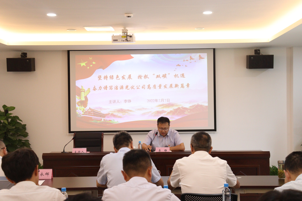 李錚以《堅持綠色發(fā)展、搶抓“雙碳”機遇,奮力譜寫潔源光伏公司高質(zhì)量發(fā)展新篇章》為題,從“把綠色發(fā)展的底色鋪好,必須深刻領(lǐng)會抓內(nèi)涵”“把綠色發(fā)展的底色鋪好,必須共謀共建強理念”“把綠色發(fā)展的底色鋪好,必須履職盡責(zé)抓落實”三個方面闡述了綠色發(fā)展的重要意義,分析了“雙碳”目標背景下新能源產(chǎn)業(yè)的發(fā)展機遇,并對潔源光伏公司下一步工作提出了具體要求。