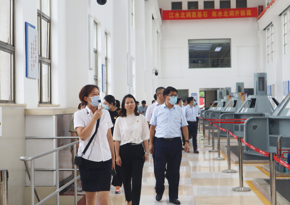 隨后大家走進江都水利樞紐第四抽水站,四站高大雄偉,是4座抽水站中規(guī)模最大的一座。四站的西面入口的上方,“江淮明珠”四個大字,金光閃閃!通過實地參觀學(xué)習(xí)以及講解員的詳細介紹,大家了解了江都水利樞紐工程歷經(jīng)17年建設(shè)和50多年運行情況,進一步深化南水北調(diào)工程的重大意義和重要作用。