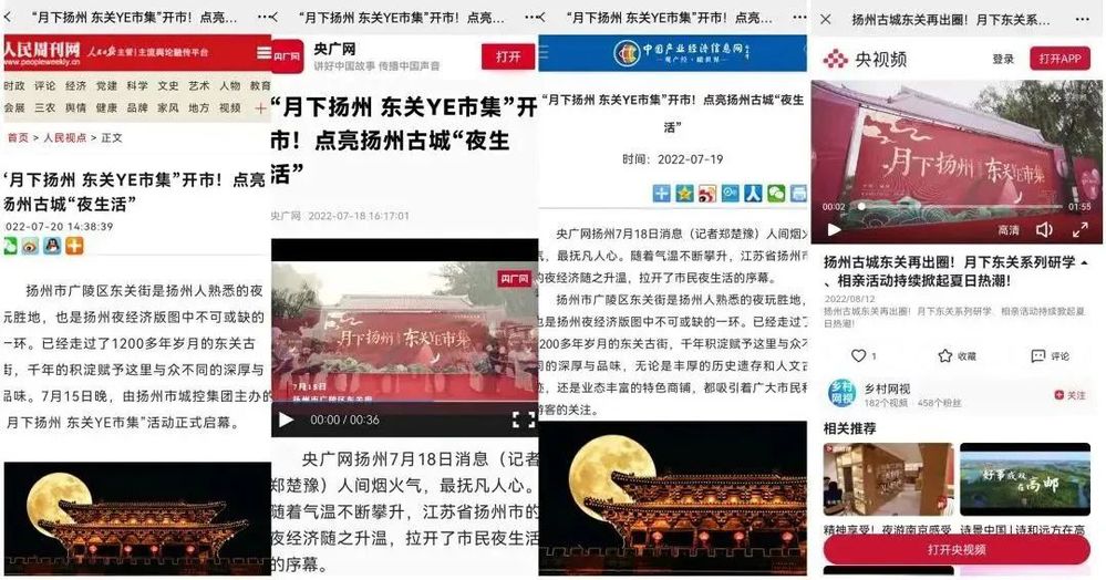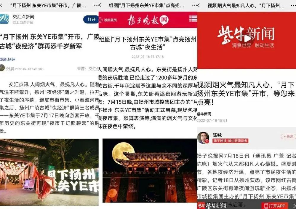 熱鬧集市異彩紛呈,吸引游客紛至沓來,點亮揚州古城夜經(jīng)濟,這也引發(fā)了多家媒體的關注與報道,包括多家國家級媒體、省市級媒體以及揚州本地自媒體。