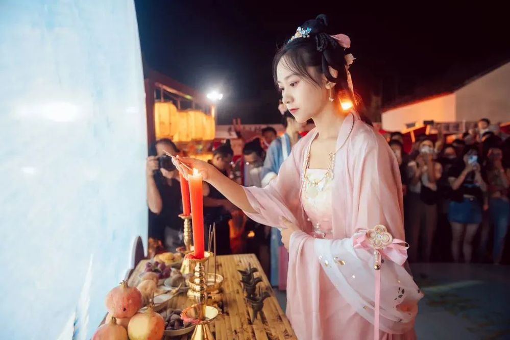 一場莊重的拜月儀式則是將活動推向高潮,設案于露天,借月光與燭光。數(shù)十位身著漢唐服飾的佳人,神情莊重、步履輕緩。