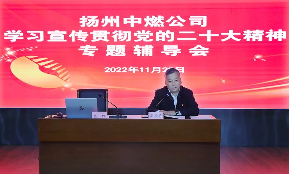 為深入學(xué)習(xí)宣傳貫徹黨的二十大精神,把揚(yáng)州中燃公司廣大黨員、干部員工的思想統(tǒng)一到黨的二十大精神上來,把力量凝聚到推動揚(yáng)州中燃公司轉(zhuǎn)型跨越發(fā)展的方向上來,2022年11月22日下午,揚(yáng)州中燃公司黨委組織開展學(xué)習(xí)宣傳貫徹黨的二十大精神專題輔導(dǎo)會。會議傳達(dá)學(xué)習(xí)了《中共中央關(guān)于認(rèn)真學(xué)習(xí)宣傳貫徹黨的二十大精神的決定》,對全公司學(xué)習(xí)宣貫黨的二十大精神進(jìn)行動員部署,邀請市委黨校吳玲老師宣講黨的二十大精神。公司領(lǐng)導(dǎo)班子成員,全體中層干部參加會議。