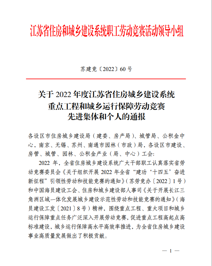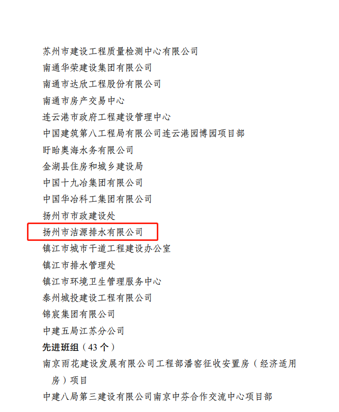 12月30日,從江蘇省住房和城鄉(xiāng)建設(shè)系統(tǒng)職工勞動(dòng)競賽活動(dòng)領(lǐng)導(dǎo)小組傳來喜訊,揚(yáng)州市潔源排水有限公司被表彰為“2022年度江蘇省住房城鄉(xiāng)建設(shè)系統(tǒng)重點(diǎn)工程和城鄉(xiāng)運(yùn)行保障勞動(dòng)競賽先進(jìn)集體”。
