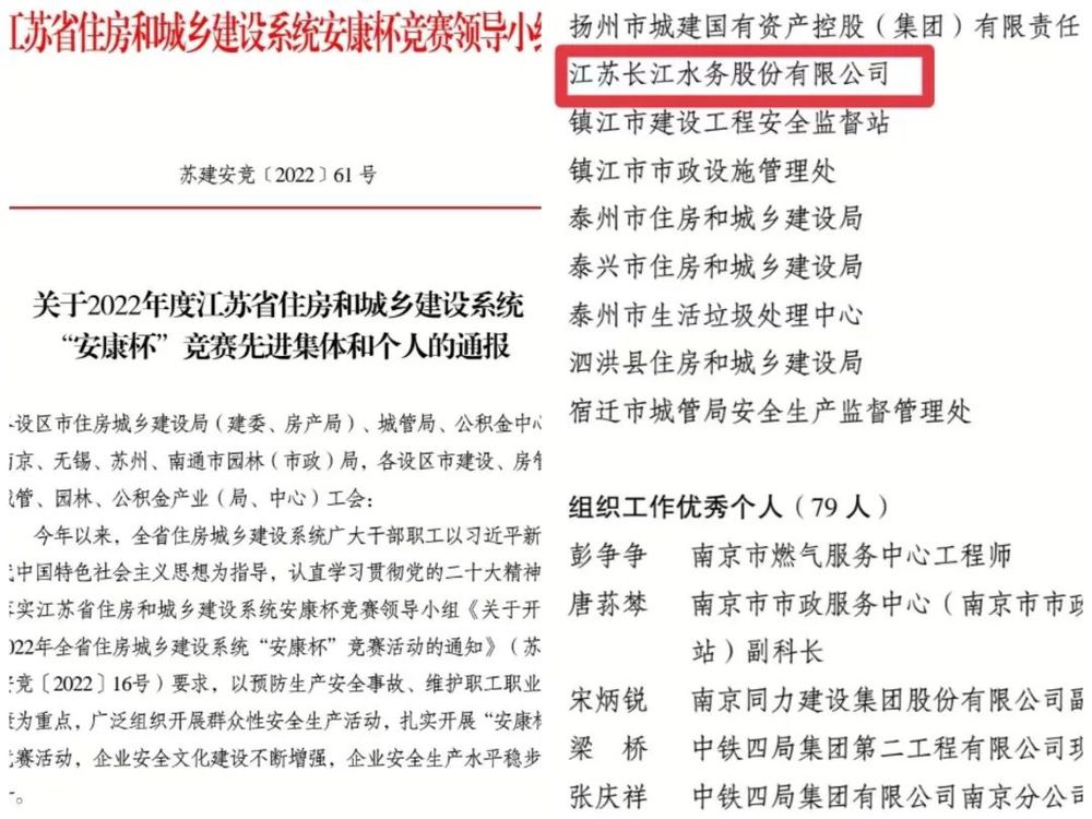 近日,省住建系統(tǒng)安康杯競賽領(lǐng)導(dǎo)小組下發(fā)表彰通報(bào),長江水務(wù)公司榮獲2022年度江蘇省住房和城鄉(xiāng)建設(shè)系統(tǒng)“安康杯”競賽組織工作優(yōu)秀單位稱號(hào)。