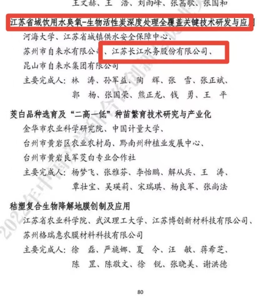 “中國(guó)產(chǎn)學(xué)研合作促進(jìn)會(huì)產(chǎn)學(xué)研合作創(chuàng)新與促進(jìn)獎(jiǎng)”由國(guó)家科技獎(jiǎng)勵(lì)工作辦公室批準(zhǔn)設(shè)立,是實(shí)施國(guó)家創(chuàng)新驅(qū)動(dòng)發(fā)展戰(zhàn)略,面向產(chǎn)學(xué)研界設(shè)立的最高榮譽(yù)獎(jiǎng)。近年來(lái),長(zhǎng)江水務(wù)不斷推動(dòng)產(chǎn)學(xué)研深度融合,與河海大學(xué)、江蘇省城鎮(zhèn)供水安全保障中心等單位聯(lián)合開展《江蘇省域飲用水臭氧-生物活性炭深度處理全覆蓋關(guān)鍵技術(shù)研發(fā)與應(yīng)用》課題研究。長(zhǎng)江水務(wù)目前已實(shí)現(xiàn)自來(lái)水深度處理100%全覆蓋,出廠水水質(zhì)指標(biāo)全面優(yōu)于國(guó)家生活飲用水衛(wèi)生標(biāo)準(zhǔn)。臭氧一生物活性炭深度處理工藝作為當(dāng)前應(yīng)用最廣泛、技術(shù)最成熟的給水處理技術(shù),為提高揚(yáng)州人民的飲用水質(zhì)量提供了技術(shù)支撐。