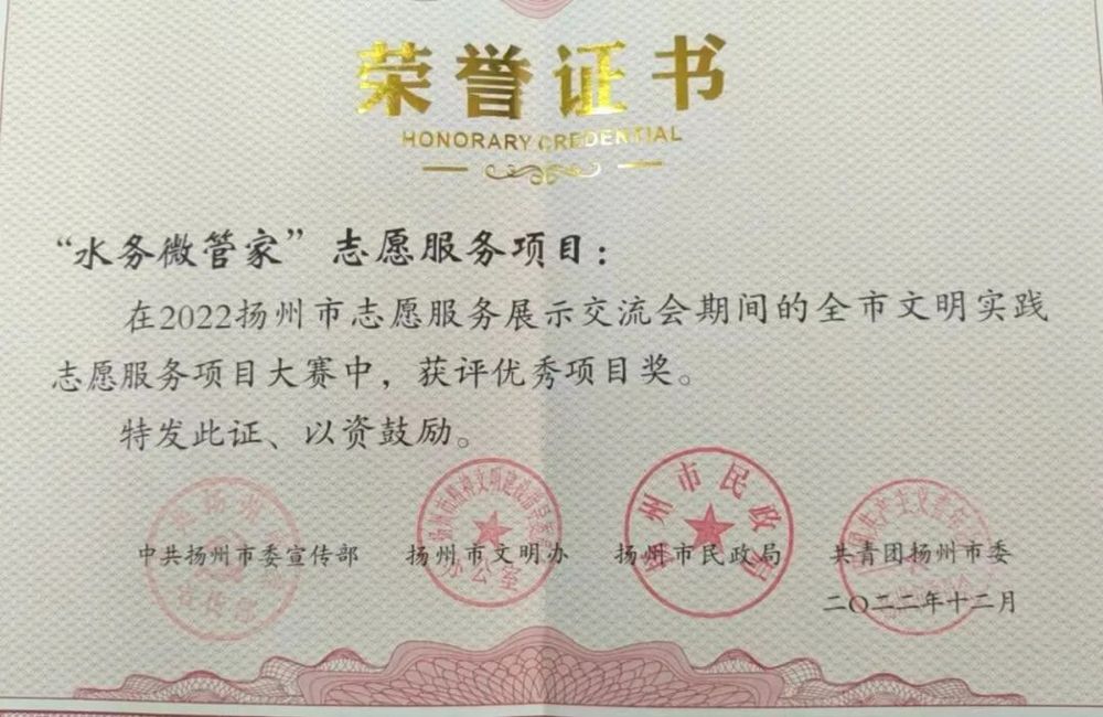 在2022年揚(yáng)州市志愿服務(wù)展示交流暨文明實(shí)踐志愿服務(wù)項(xiàng)目大賽中,長(zhǎng)江水務(wù)“水務(wù)微管家”志愿服務(wù)項(xiàng)目脫穎而出,被市委宣傳部、市文明辦、市民政局、共青團(tuán)揚(yáng)州市委評(píng)為優(yōu)秀項(xiàng)目獎(jiǎng)。