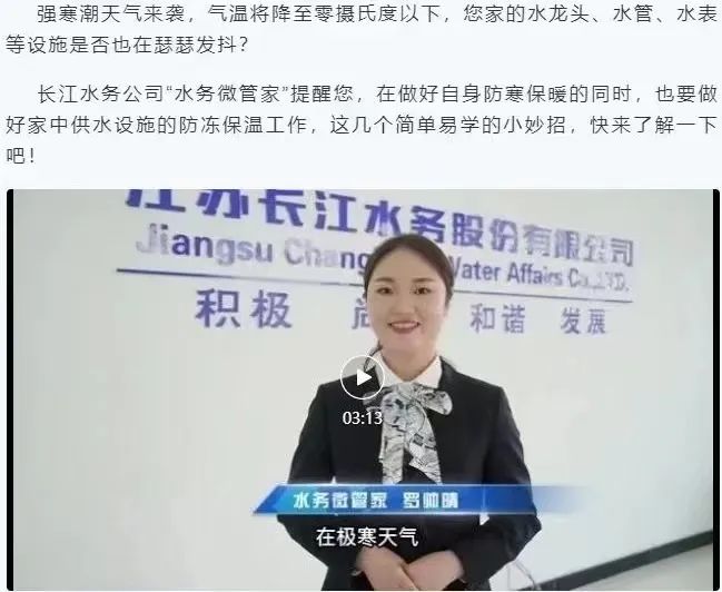 “水務(wù)微管家”開(kāi)通企業(yè)微信平臺(tái),攝制多條微視頻,推送供水服務(wù)咨詢(xún),普及自來(lái)水知識(shí),與重點(diǎn)用水企業(yè)實(shí)現(xiàn)“一對(duì)一”線(xiàn)上線(xiàn)下聯(lián)動(dòng)服務(wù)。在寒潮降溫前,通過(guò)企業(yè)微信平臺(tái)、社區(qū)網(wǎng)格、志愿者服務(wù)微信群密集發(fā)布冬季自來(lái)水防凍提醒,上門(mén)為老年用戶(hù)和弱勢(shì)群體做好冬季用水設(shè)施的防凍保溫措施。