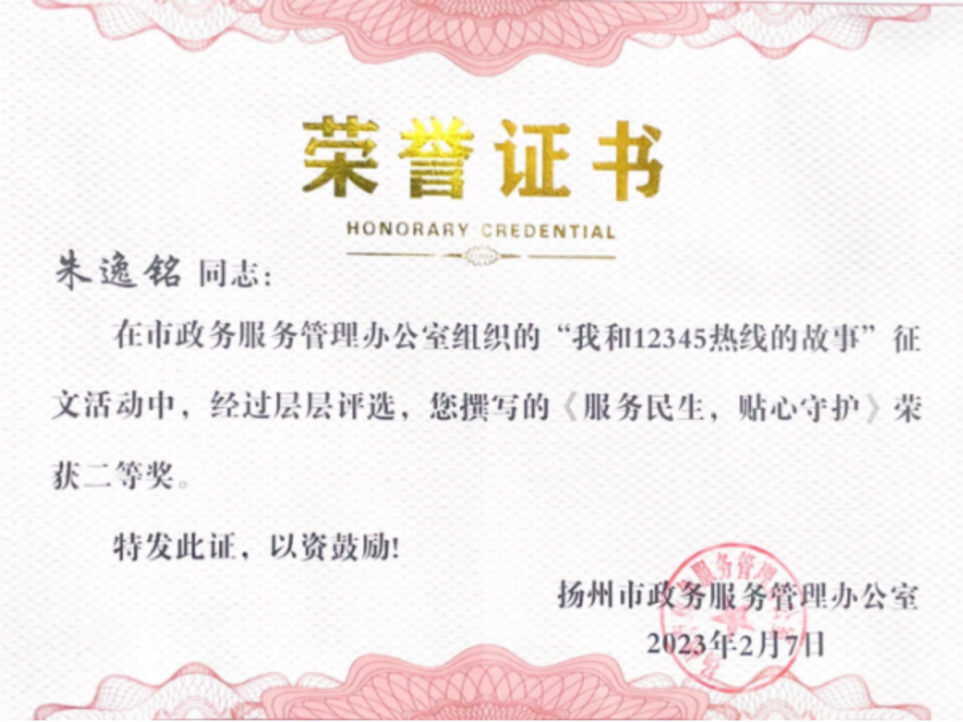 近日,揚(yáng)州市政管網(wǎng)有限公司選送的文章《服務(wù)民生、貼心守護(hù)》在揚(yáng)州市政務(wù)服務(wù)管理辦公室組織的“我和12345的故事”征文活動(dòng)中,經(jīng)過層層評(píng)選,榮獲二等獎(jiǎng)。