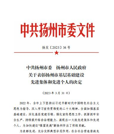 近日,揚州市委、市政府發(fā)布《關(guān)于表彰揚州市基層基礎(chǔ)建設(shè)先進集體和先進個人的決定》,表彰了過去一年在“強富美高”新?lián)P州建設(shè)中,在加強基層基礎(chǔ)建設(shè)、深化基層黨建引領(lǐng)、強化宣傳思想工作、抓緊抓牢安全生產(chǎn)、持續(xù)提升綜合治理能力等多個方面涌現(xiàn)出的一批銳意進取、改革創(chuàng)新、勇于擔當、善于作為的先進集體和先進個人。