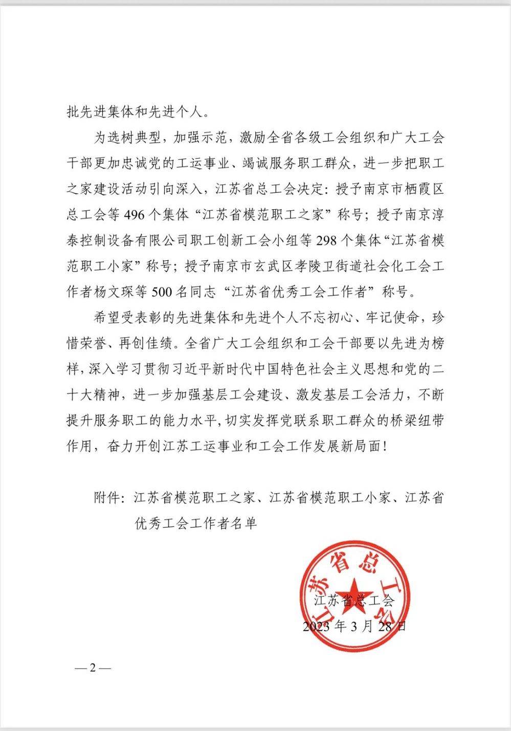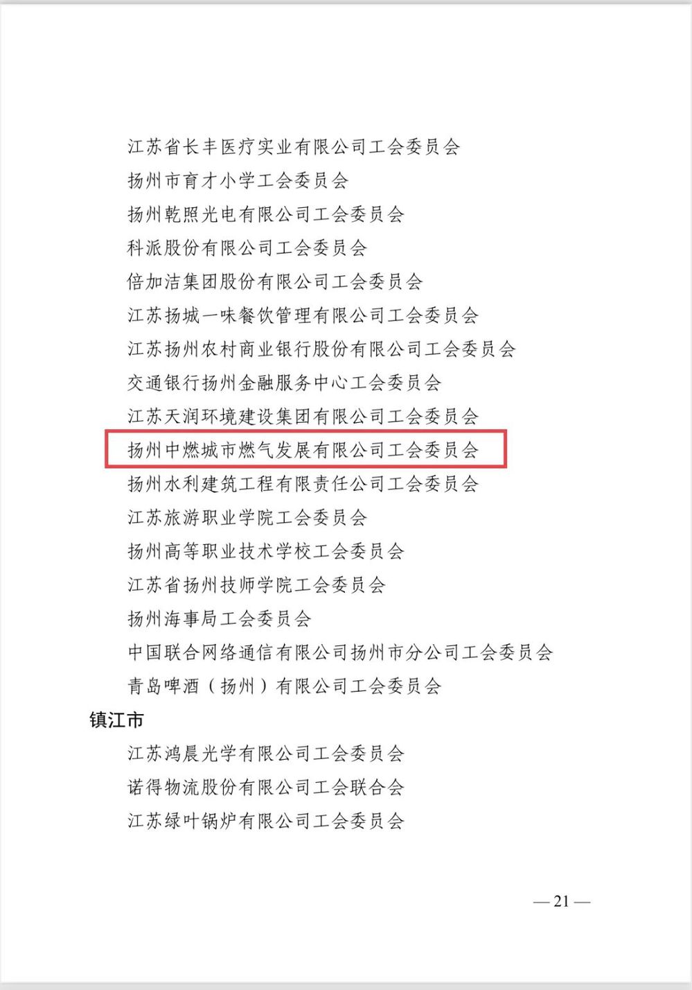 2023年4月19日,江蘇省工會第十五次代表大會在南京勝利閉幕。大會對省五一勞動獎狀和省工人先鋒號、省五一勞動獎章、省模范職工之家等先進集體和個人進行表彰,揚州中燃公司工會被授予“省模范職工之家”光榮稱號。