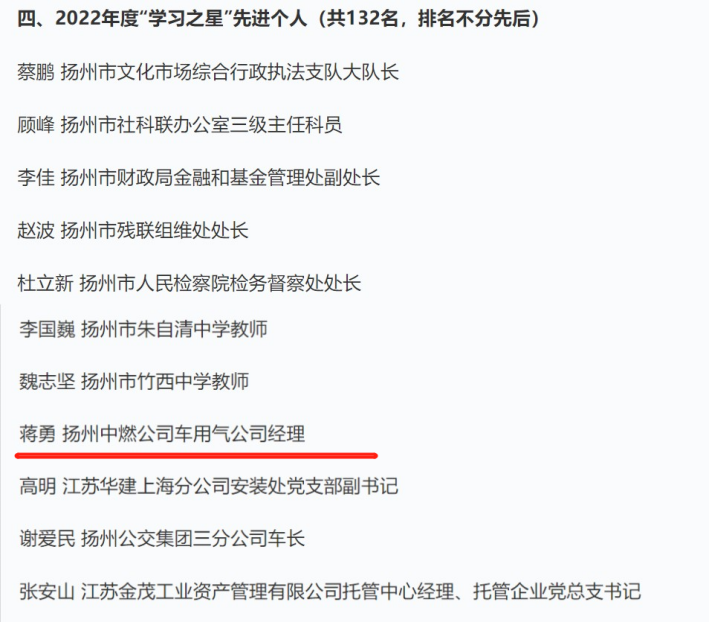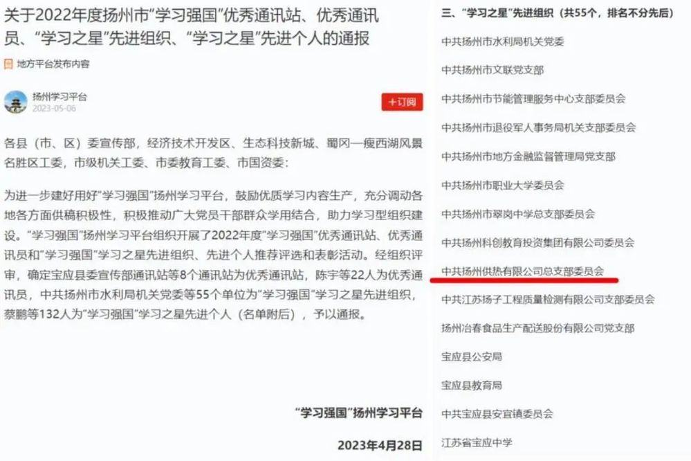 近日,“學(xué)習(xí)強(qiáng)國”揚州學(xué)習(xí)平臺發(fā)布了《關(guān)于2022年度揚州市“學(xué)習(xí)強(qiáng)國”優(yōu)秀通訊站、優(yōu)秀通訊員、“學(xué)習(xí)之星”先進(jìn)組織、“學(xué)習(xí)之星”先進(jìn)個人的通報》,集團(tuán)下屬供熱公司黨總支被表彰為2022年度揚州市“學(xué)習(xí)強(qiáng)國”“學(xué)習(xí)之星”先進(jìn)組織、揚州中燃公司蔣勇被表彰為“學(xué)習(xí)之星”先進(jìn)個人榮譽稱號。