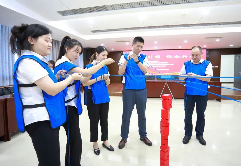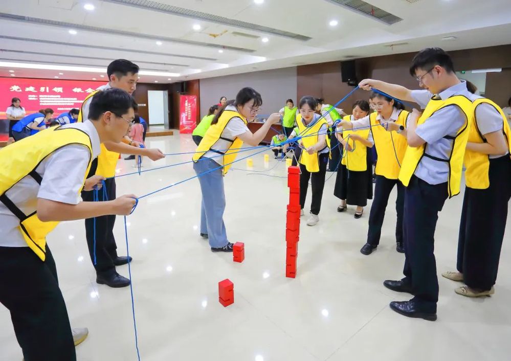 此次共建活動(dòng)在歡快輕松的氛圍中進(jìn)行,為充分調(diào)動(dòng)大家的參與熱情,在主持人熱情地引導(dǎo)下,大家首先進(jìn)行了熱身。熱身活動(dòng)后,揚(yáng)州中燃公司和三家銀行組建三支團(tuán)隊(duì)依次開(kāi)展“環(huán)游世界八十天”、“達(dá)芬奇密碼”、“聯(lián)合攻城”等一系列團(tuán)隊(duì)協(xié)作競(jìng)賽。大家在競(jìng)賽互動(dòng)中不斷磨合,增強(qiáng)了彼此之間的信任感和團(tuán)隊(duì)凝聚力?!奥?lián)合攻城”作為競(jìng)賽環(huán)節(jié)的最后一個(gè)項(xiàng)目,將現(xiàn)場(chǎng)的氣氛推到一個(gè)高潮。“聯(lián)合攻城”需要隊(duì)員們同時(shí)操控手中的繩子,利用三角形的鉤子,將現(xiàn)場(chǎng)的八塊積木堆積成一個(gè)柱子,堆積過(guò)程中手不可觸碰積木,且柱子不倒塌視為完成競(jìng)賽,用時(shí)最少的隊(duì)伍獲勝。這項(xiàng)競(jìng)賽既考驗(yàn)了隊(duì)員們之間的團(tuán)隊(duì)協(xié)作能力,又考驗(yàn)了每一位隊(duì)員的心理素質(zhì)和應(yīng)對(duì)能力,大家在團(tuán)結(jié)緊張活潑的氣氛中感受著充滿挑戰(zhàn)競(jìng)賽過(guò)程和完成項(xiàng)目的喜悅。