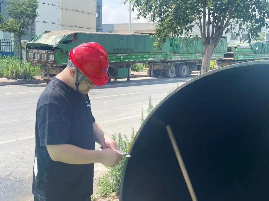 惡劣天氣,尤其是陰雨連綿,是對材料驗收更嚴(yán)峻的考驗。為防止水穩(wěn)和基層被雨水浸濕,顧濤一邊要求工人加快攤鋪速度,一邊俯身檢查水穩(wěn)層是否有松散跡象。雨水濕衣,泥濘滿褲,他仍堅持在泥水里仔細(xì)核對,檢查到場管材是否存在裂縫、破損。無論是深夜的困倦,還是惡劣的環(huán)境,都無法動搖他堅守的責(zé)任心,他用日復(fù)一日的“零容忍”的嚴(yán)謹(jǐn)態(tài)度、“隨時待命”的敬業(yè)精神,守護(hù)著每一批材料的品質(zhì),為市政道路建設(shè)的雨污水暢通和景觀煥新筑牢根基。