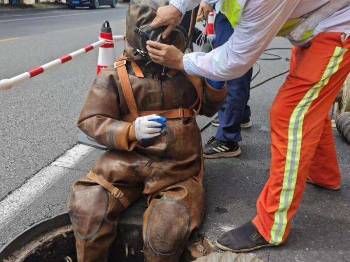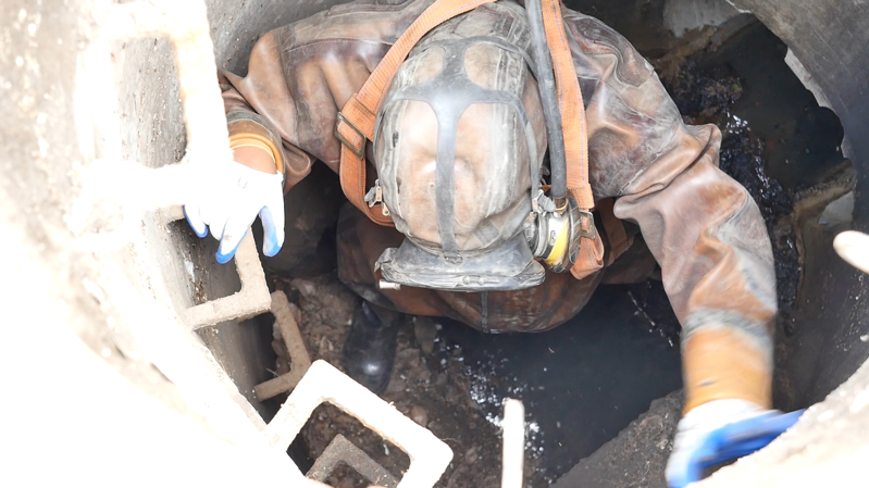 對(duì)于井室和管道內(nèi)存在的大塊水泥和混凝土,常規(guī)方法難以清除,只能通過人工下井清掏。穿上厚重的防護(hù)服、戴上防毒面具、系好安全繩,相榮慢慢降入井中。管道內(nèi)悶熱潮濕、空氣混濁。“井下溫度比地面還高,像蒸桑拿?!痹谥睆絻H700mm的井室內(nèi),相榮用風(fēng)鎬將水泥塊打碎,并用小桶將打碎的水泥碎塊裝進(jìn)去,再由井上面的輔助人員一桶一桶的拎上來,并及時(shí)裝入垃圾袋,當(dāng)天集中清運(yùn)。經(jīng)過兩個(gè)小時(shí)的奮戰(zhàn),他們終于疏通了這段兩米多長(zhǎng)的堵塞管道。當(dāng)相榮被上面兩個(gè)輔助人員通過三腳架及安全繩拉上來時(shí),汗水濕透了他的衣服。