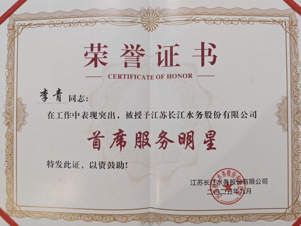 如今,公司授予李青“長江水務(wù)首席服務(wù)明星”榮譽稱號,這不僅是對他三十余載在一線崗位默默耕耘、無私奉獻的充分肯定,更是對他始終堅守初心、踐行服務(wù)為民宗旨崇高精神的最高贊譽。這份榮譽不僅彰顯了李青個人的成就,更凝聚著全體水務(wù)一線員工的辛勤付出。