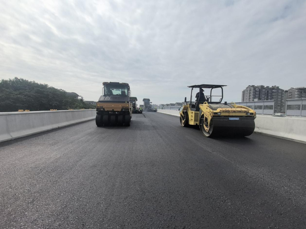 施工過程中,現(xiàn)場攤鋪機、壓路機等設(shè)備有序作業(yè),管理人員對原材料質(zhì)量、攤鋪溫度、厚度及平整度進行嚴格控制,確保各項施工符合各項規(guī)范要求,為后續(xù)橋面交通標志標線施劃、智能交通監(jiān)控設(shè)施及亮化設(shè)備安裝打下基礎(chǔ)。