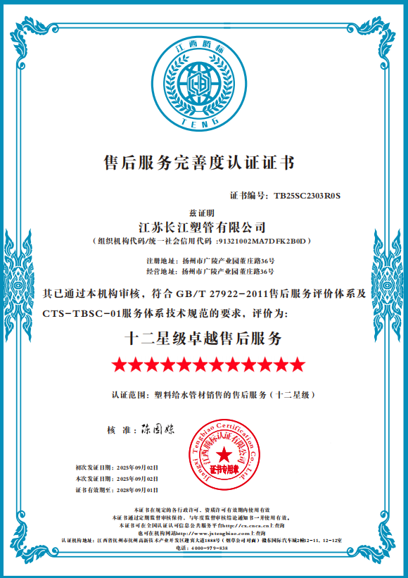 2025年,江蘇長(zhǎng)江塑管有限公司接連榮獲AAA級(jí)信用企業(yè)蟬聯(lián)認(rèn)證與十二星級(jí)卓越售后服務(wù)評(píng)價(jià)。這兩項(xiàng)沉甸甸的榮譽(yù),不僅是國(guó)家權(quán)威機(jī)構(gòu)的高度認(rèn)可,更是企業(yè)全體員工在生產(chǎn)一線以汗水與擔(dān)當(dāng)書(shū)寫(xiě)的奮斗答卷。