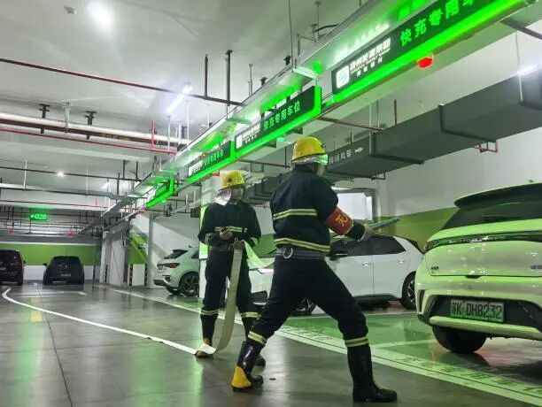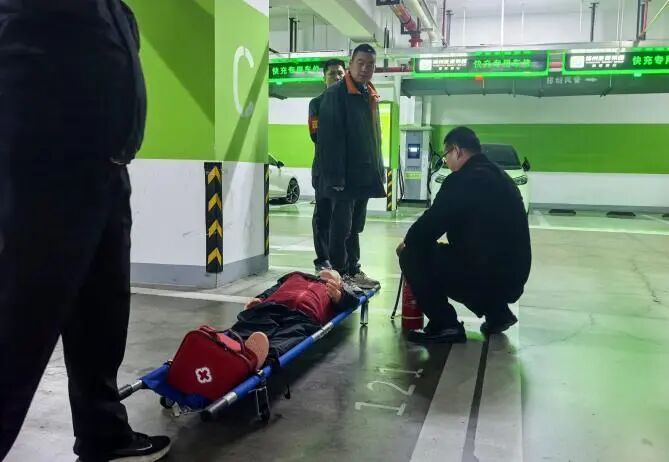 本次演習(xí)模擬地下車庫充電樁線路因短路引發(fā)起火、濃煙蔓延的險情。煙感報警觸發(fā)后,商場立即啟動充電樁火災(zāi)應(yīng)急預(yù)案,各專項小組嚴(yán)格按照預(yù)案要求高效聯(lián)動:警戒組快速劃定警戒區(qū)域;通訊組精準(zhǔn)通知車庫內(nèi)車主緊急移車;疏散組引導(dǎo)商戶及工作人員沿指示標(biāo)識撤離;滅火組穿戴專業(yè)防護(hù)裝備,嚴(yán)格遵循“斷電優(yōu)先、精準(zhǔn)撲救”的處置原則,成功撲滅模擬火情。