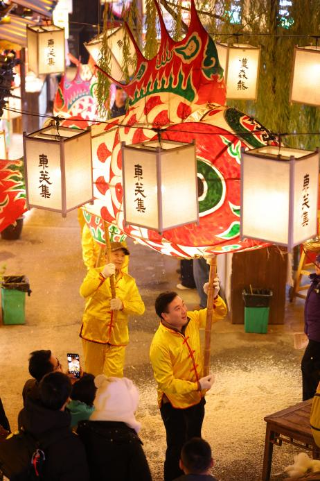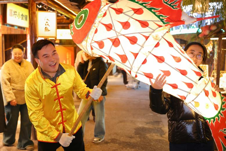 活動(dòng)現(xiàn)場(chǎng),三十余盞手工制作的巨型魚(yú)燈璀璨生輝。巡游隊(duì)伍身著傳統(tǒng)服飾,手持“年年有魚(yú),國(guó)泰民安”主題的彩色魚(yú)燈,在鑼鼓聲中沿古街徐徐前行,吸引眾多游客駐足觀賞?!斑@魚(yú)燈巡游的‘嬉魚(yú)’老傳統(tǒng),聽(tīng)我祖輩說(shuō)已有六百多年歷史。今年能從臘月一直熱鬧到過(guò)年,真是太好了!”原住民王老太望著巡游隊(duì)伍,欣慰地說(shuō)道。